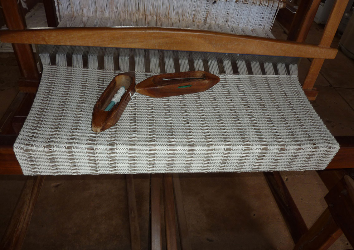 Roselinda, Solange, Dona Rosa, Fatima, Dona Lurdes… travaillent avec nous pour réaliser les plaids et couvre-lits de cette collection. Les unes filent le coton écru sur des rouets tout simples. Leurs doigts experts étirent le coton pour former des fils solides de différents titrages. Les teintures végétales sont concoctées dans un atelier en plein air à partir de pelures d’oignons, de feuilles d’eucalyptus, de mangue, de bois d’ipé, de goyave… Les tisseuses travaillent dans un vaste local équipé de quelques métiers rudimentaires mais efficaces et les finitions sont faites au crochet ou aux doigts pour le nouage des franges.